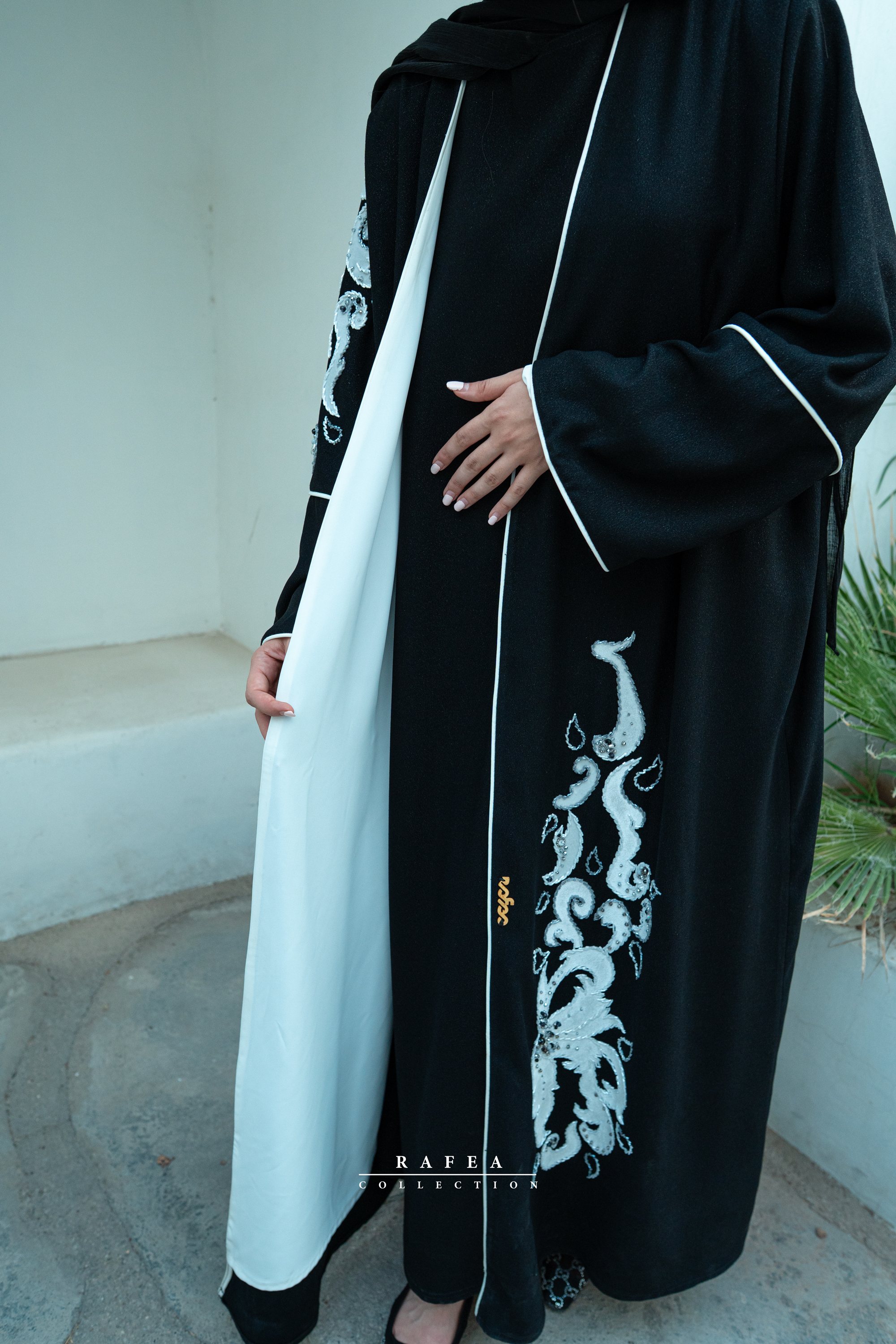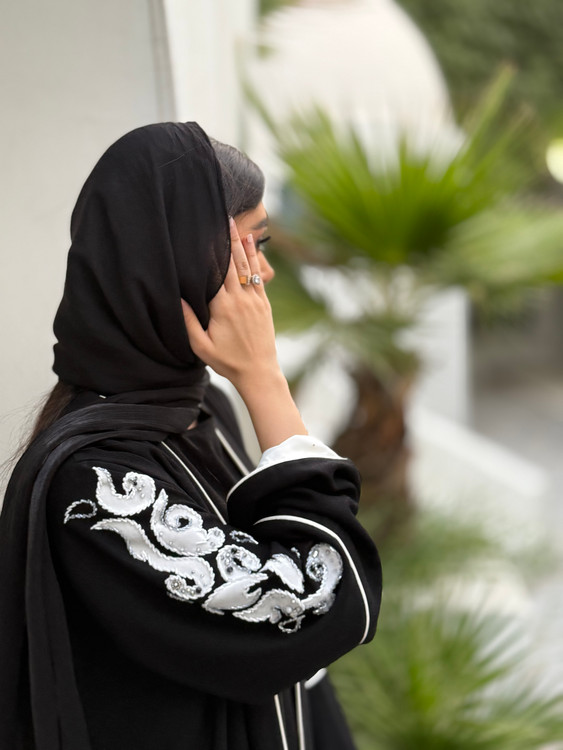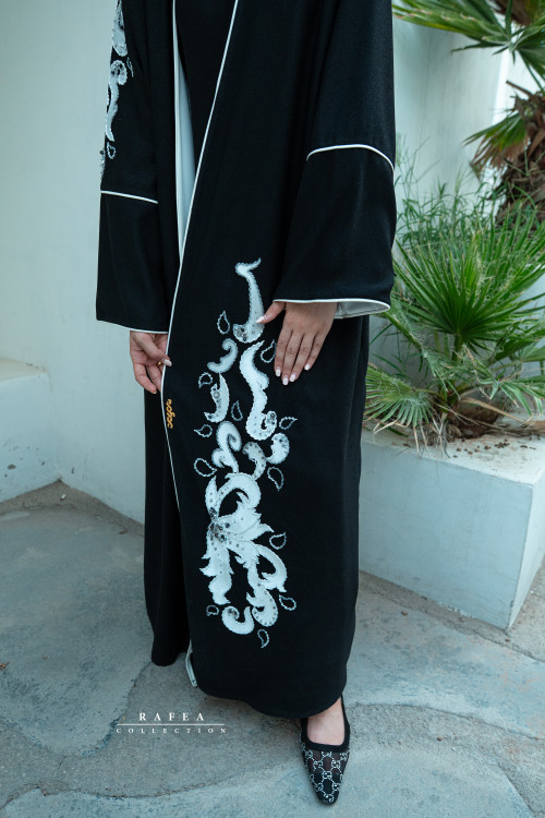 تمام طرح روی عبا مخمل سفید و دور تا دور جواهر دوزی سفید و طوسی دارد