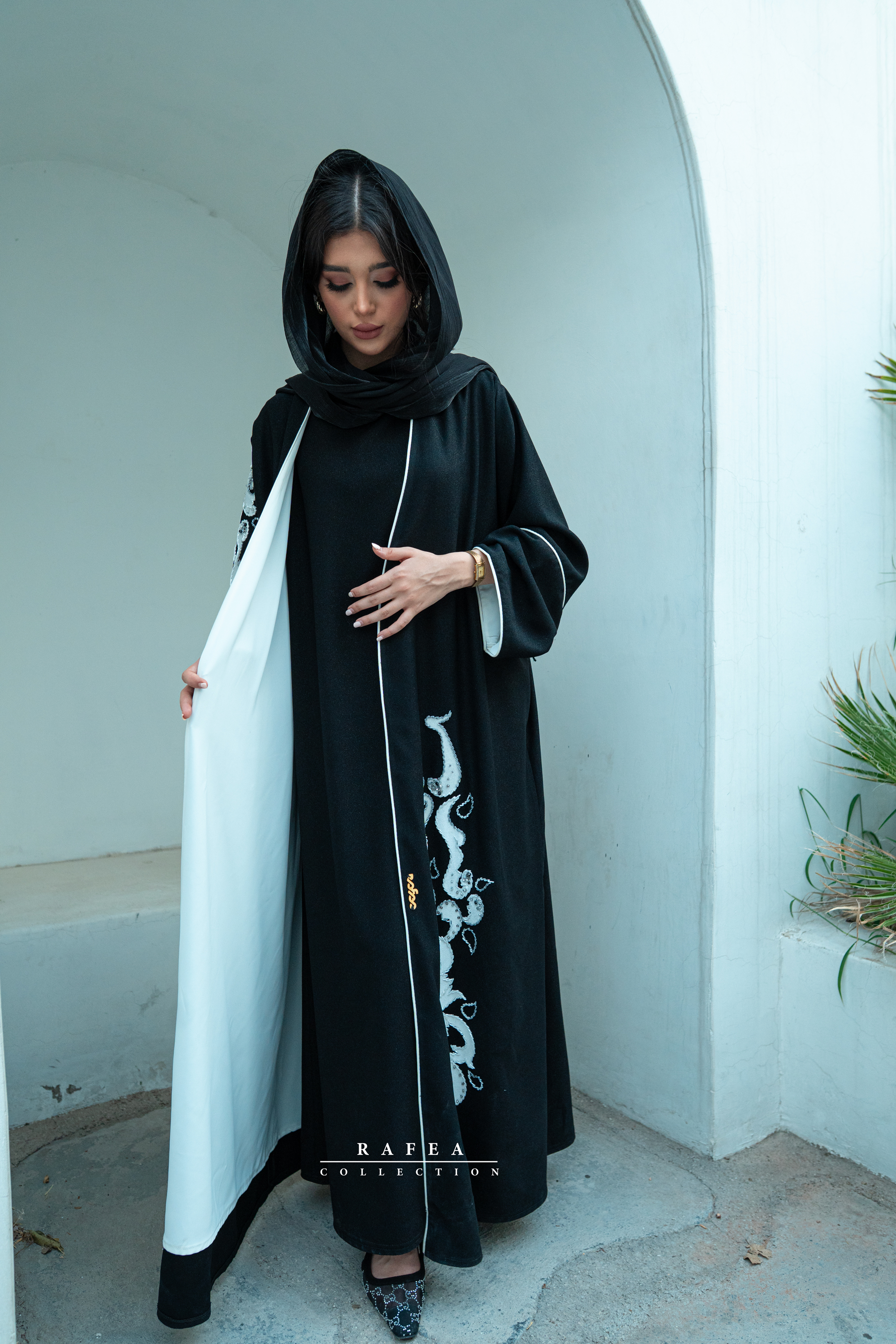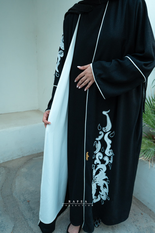 عبا دارای آستری از جنس کرپ الیزه ی سفید است.