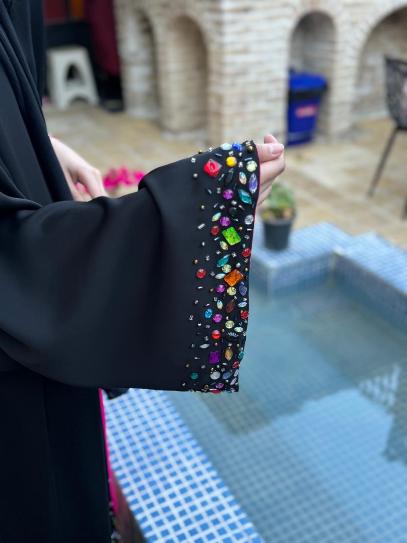 عبای تیهو با آستری صورتی یک انتخاب عالی برای مجالس است روی هر دو دست جواهردوزی انجام شده و در قیک سمت عبا در قسمت پایین هم جواهردوزی زیادی که دونه دونه با دست سنگ ها دوخته شده ،انجام شده است امیدوارم مورد پسند شما باشد