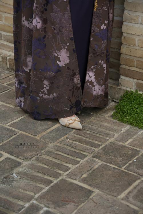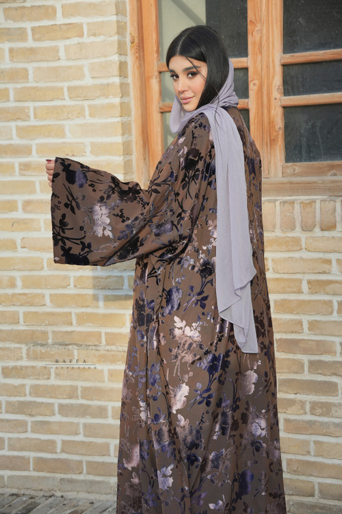 عبای سانیا دارای پارچه ی وارداتی است که در اصل توری با گل های مخمل است و با لایی کوبی بسیار حرفه ایی و دائمی ،پارچه سازی شده و اصلا دید ندارد ،سبک و خنک و بسیار زیبا با گلهای بنفش و قهوه ایی است.قابل ست با هر دو سارافون نسکافه ایی و بنفش است.
