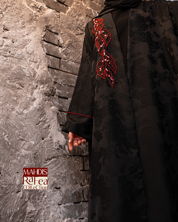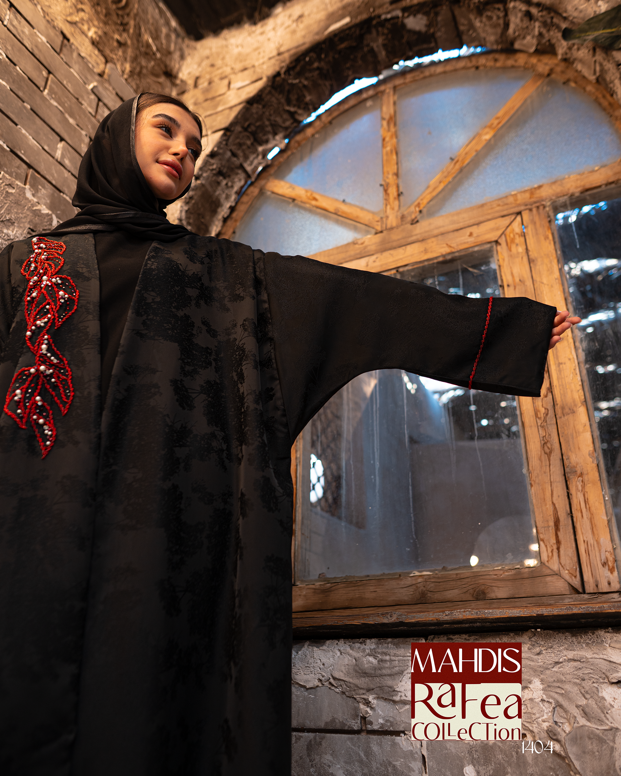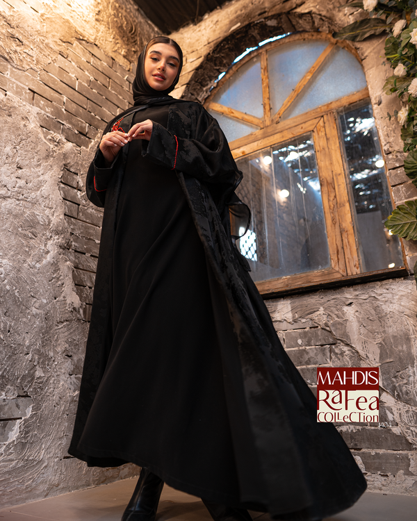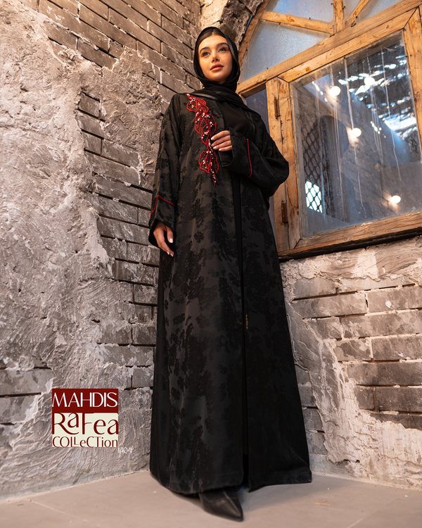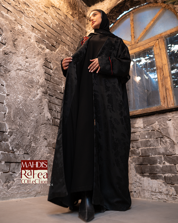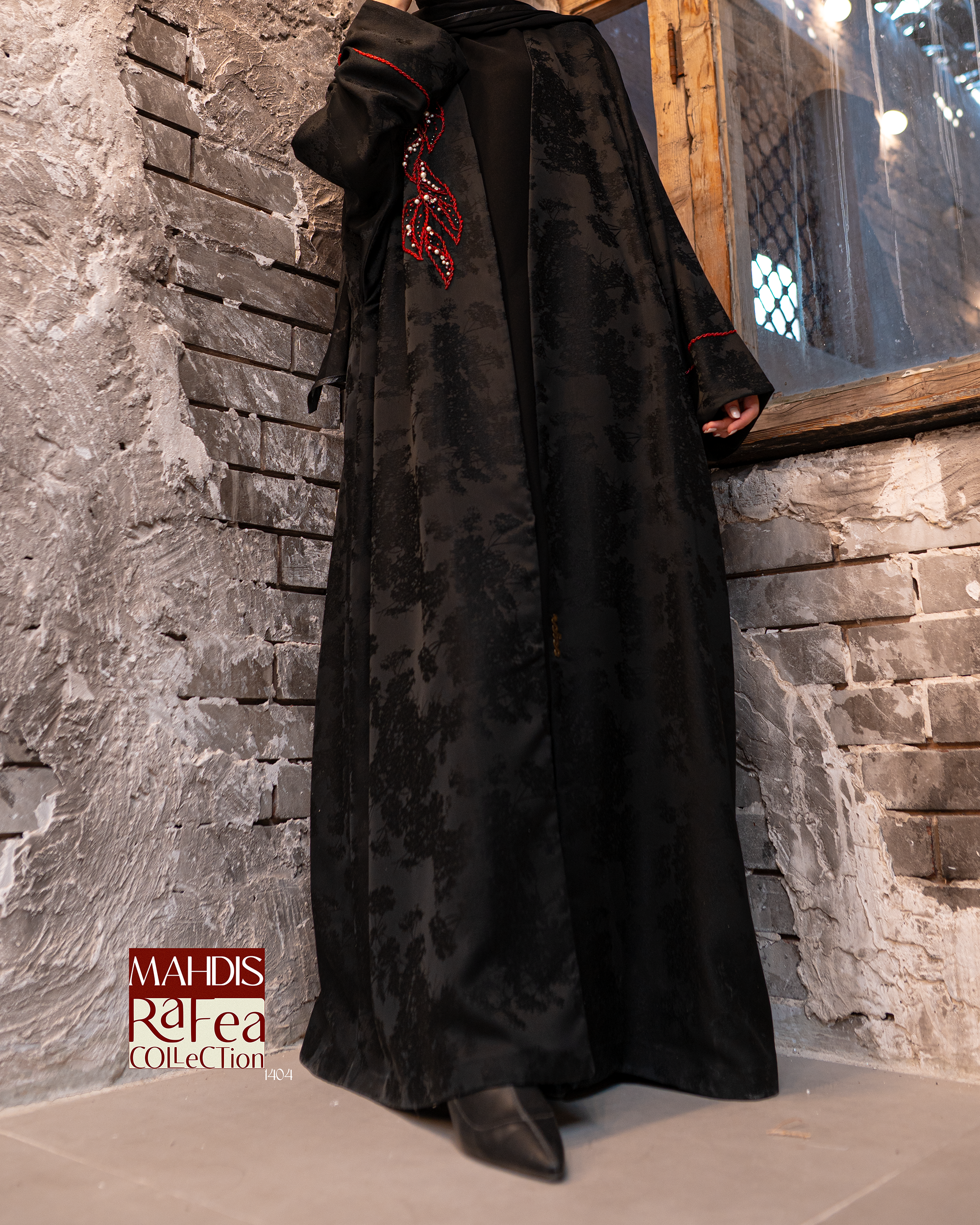 عبای ماه دیس با پارچه ی ژاکارد مشکی دوخته شده که بسیار نرم و خوش حالته و زیر عبا آستری دوخته شده شده از جنس حریر درجه یک مشکی ،برای تنوع و زیبایی در طراحی ،روی این عبا در قسمت جلوی سینه جواهردوزی انجام شده که قرمزی جواهردوزی روی رنگ مشکی عبا بی نظیر است.