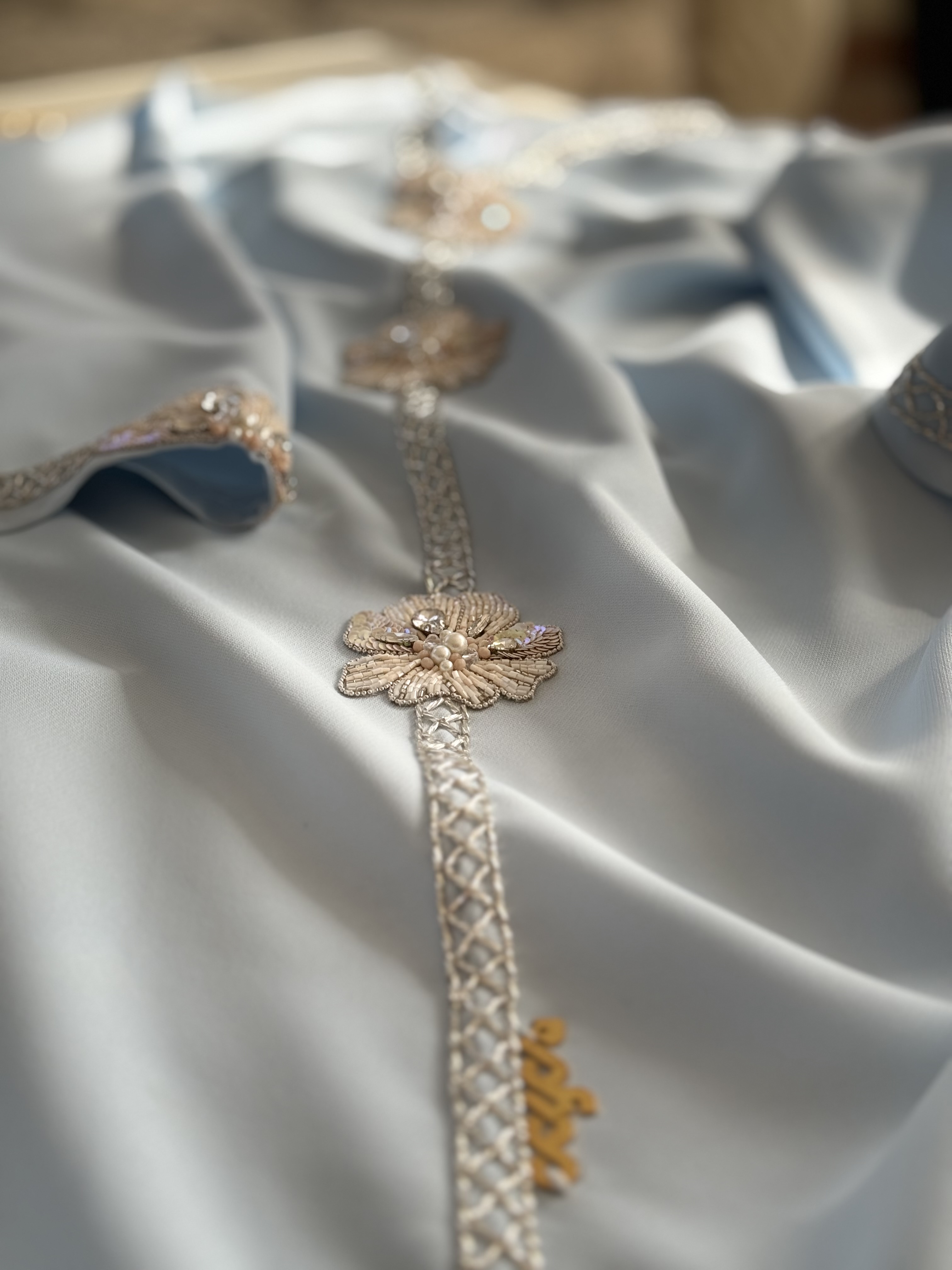 رنگ عبا: ابی اسمانی است و عکس های کمرنگ به خود عبا نزدیک است