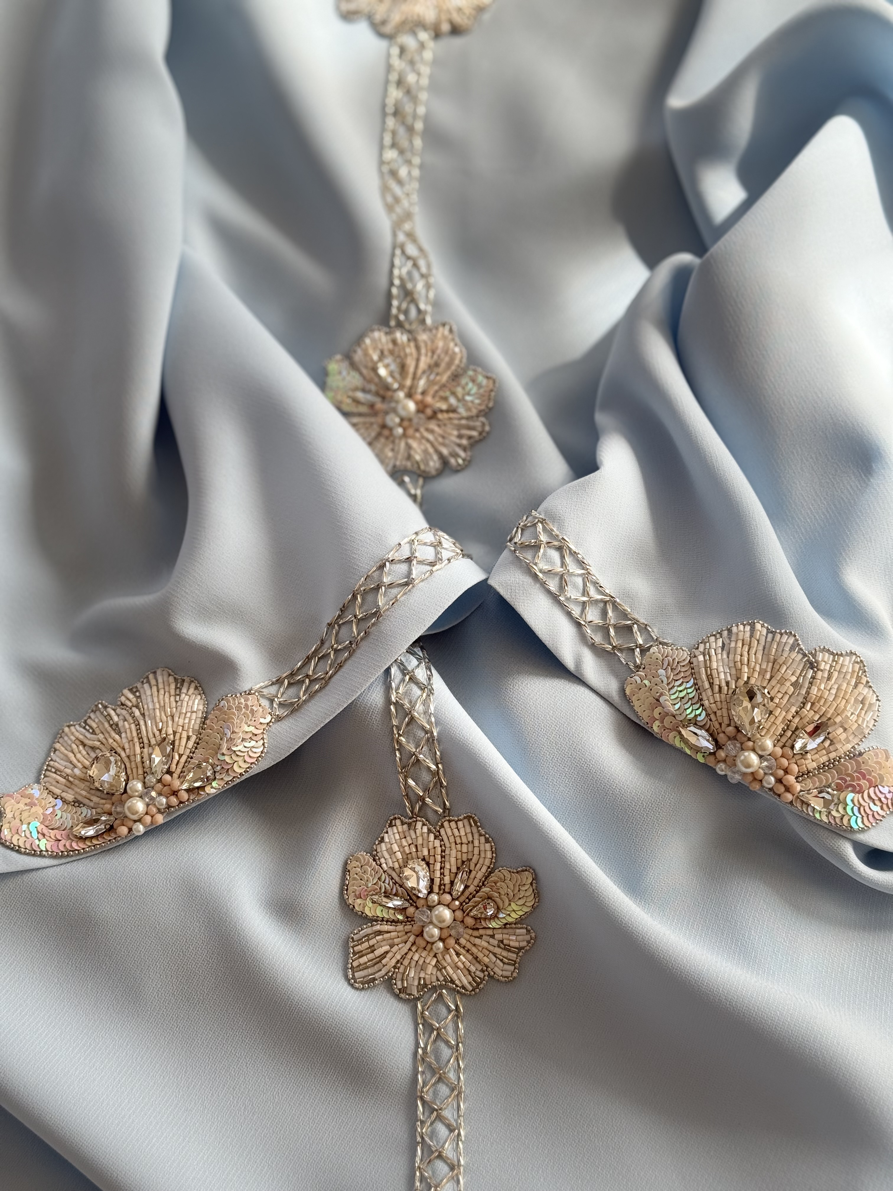 ابی اسمانی است و عکس های کمرنگ به خود عبا نزدیک است